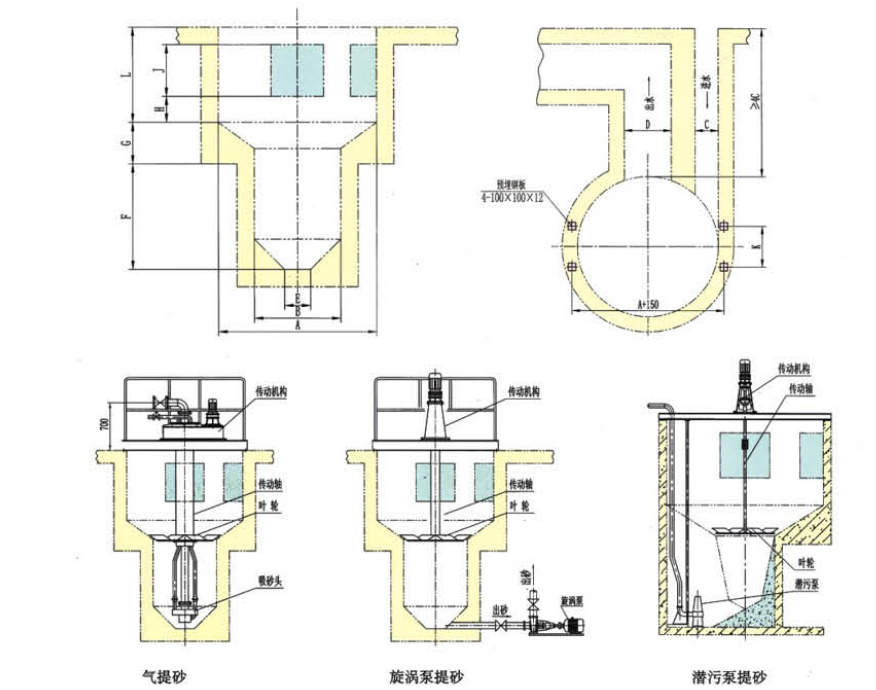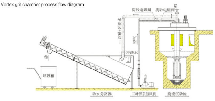 工作原理及構造:進水從切線方向進入池中,形成旋流,軸向流攪拌機控制水流的流速與流態,水流夾帶大 量粘附有機物的砂,在槳板攪拌剪切下相互剝離,砂依靠砂的自身重力和旋流作用向中 心砂斗下沉,剝離的有機物隨軸向水流向上溢走。砂斗積聚的砂經空氣提升泵或砂泵提 升,砂與少量污水進入池外砂水分離器內,砂分離外排,污水回流至格柵井。